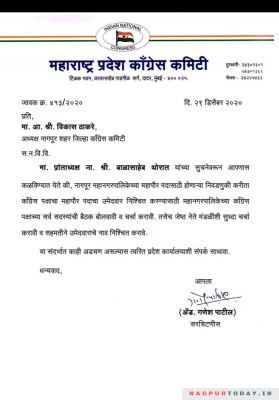 बताया जा रहा कि प्रदेश कांग्रेस ने शहर कांग्रेस के अध्यक्ष विकास ठाकरे को पत्र लिख सूचित किया कि महापौर-उपमहापौर चुनाव के लिए कांग्रेसी नगरसेवकों और शहर के कांग्रेस नेताओं की बैठक कर उम्मीदवारों का चयन किया जाए। इस आदेश का पालन करते हुए विधायक विकास ठाकरे ने मनपा में 12.30 बजे एक बैठक लेकर उम्मीदवार के नाम फाइनल किए। इसके पूर्व कांग्रेस का दूसरा गुट मनपा में विपक्ष नेता तानाजी वनवे के नेतृत्व में उम्मीदवारों का चयन कर उनका नामांकन भर चुके थे।